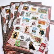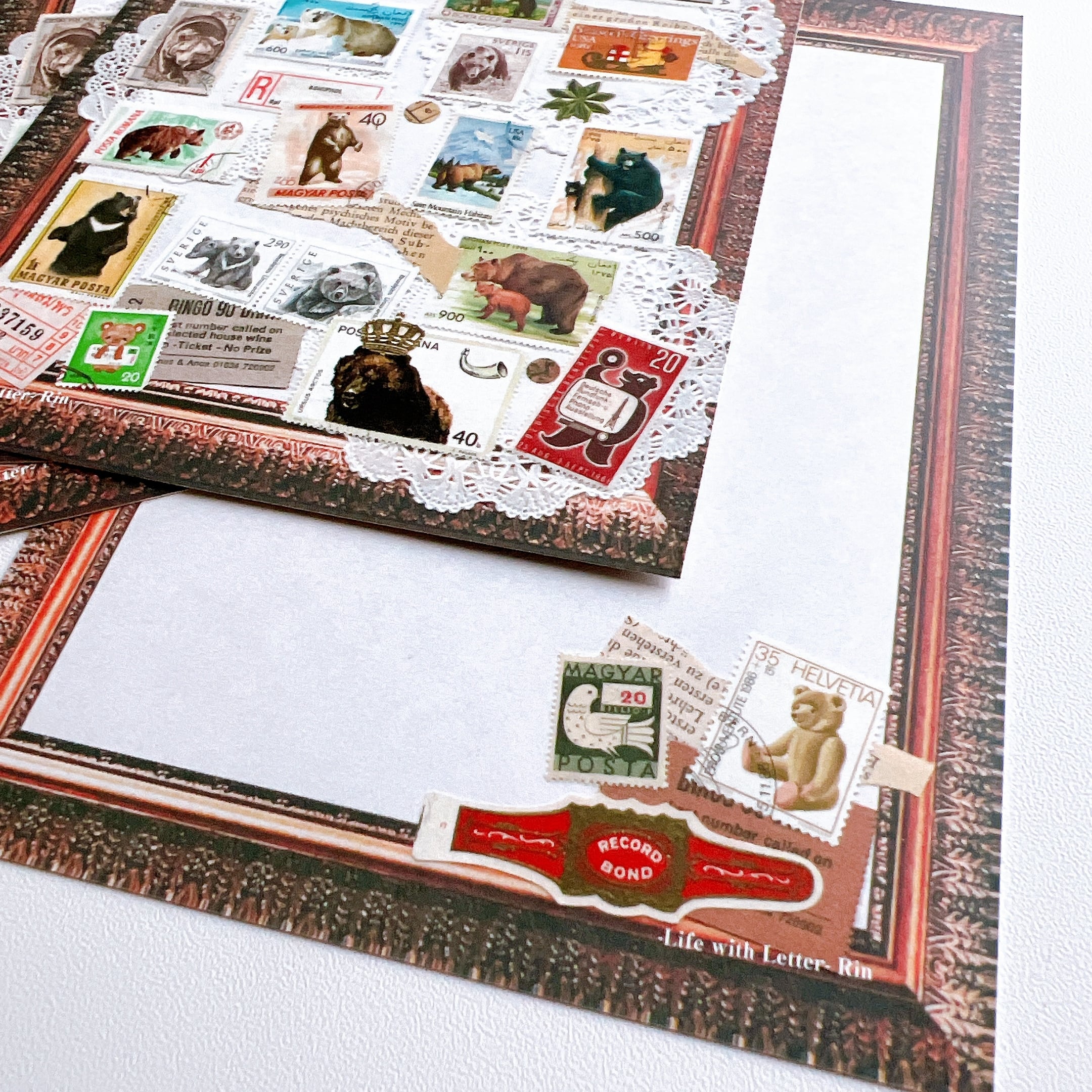 世界中のクマの古い切手と、クロモス、古いチケットなどの紙ものをコラージュして制作しました。消印や切手に書かれている世界中の文字もいっしょに、楽しんでください。
