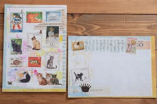 世界中のネコの古切手を使ってコラージュ制作した